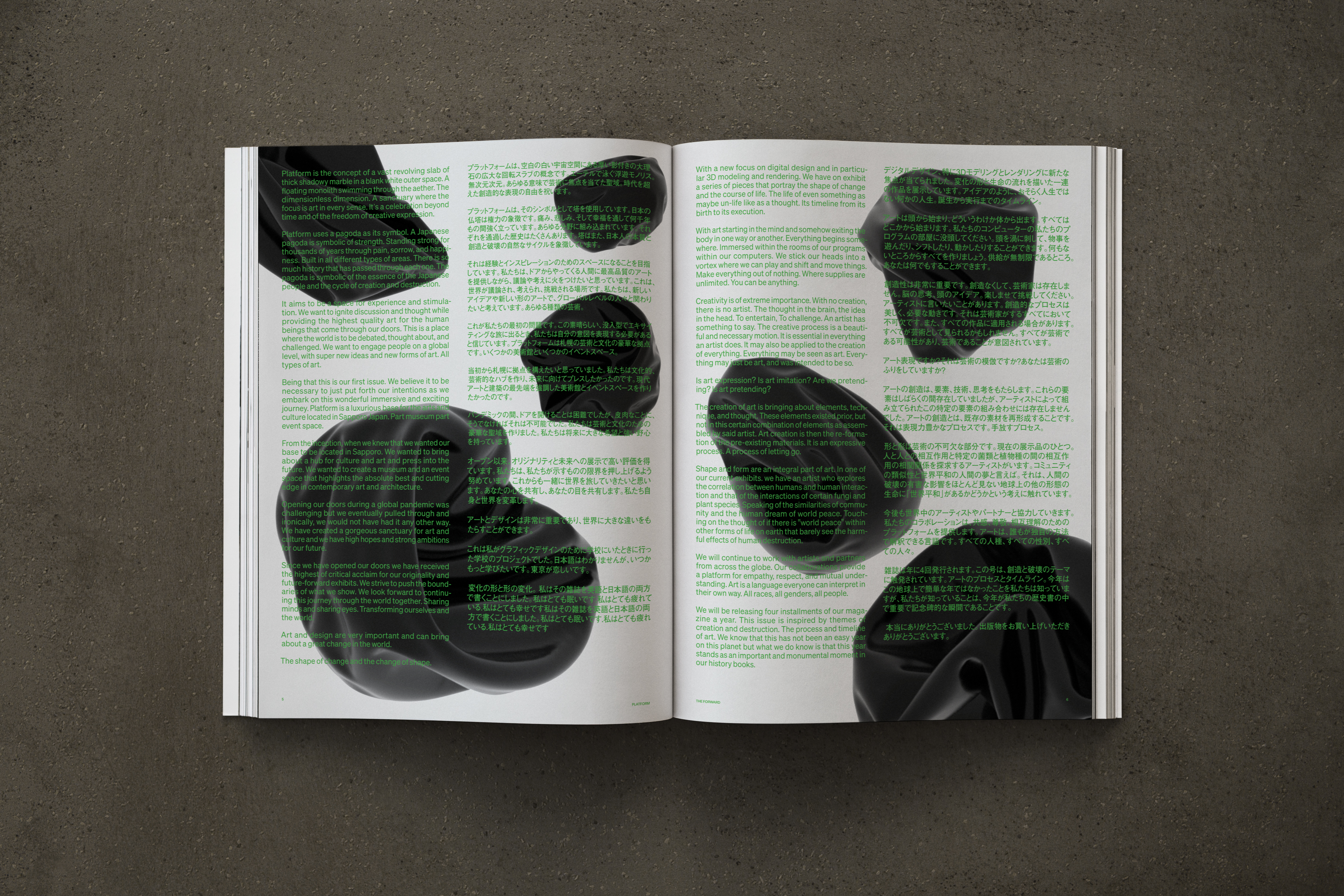 platform, a museum and event space located in sapporo, japan, amplifies the voices of artists. the concept of a floating monolith in the aether. this is a place where art is at the center of everything. the theme of the current exhibit is creation and destruction.